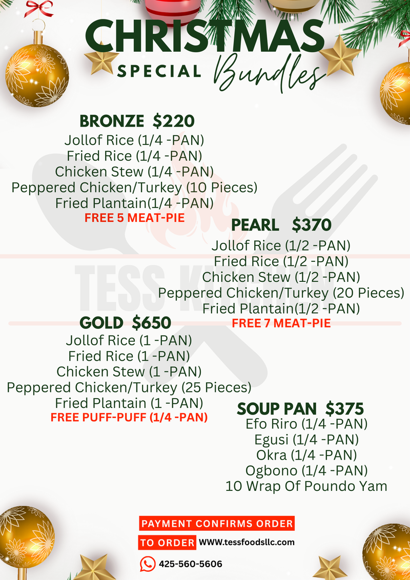 At Tess Kitchen, we bring you delicious, freshly prepared Nigerian dishes made with the authentic Niger Delta touch. From rich soups to flavorful jollof rice and classic home-style meals, every dish is cooked with care, tradition, and the true taste of home.